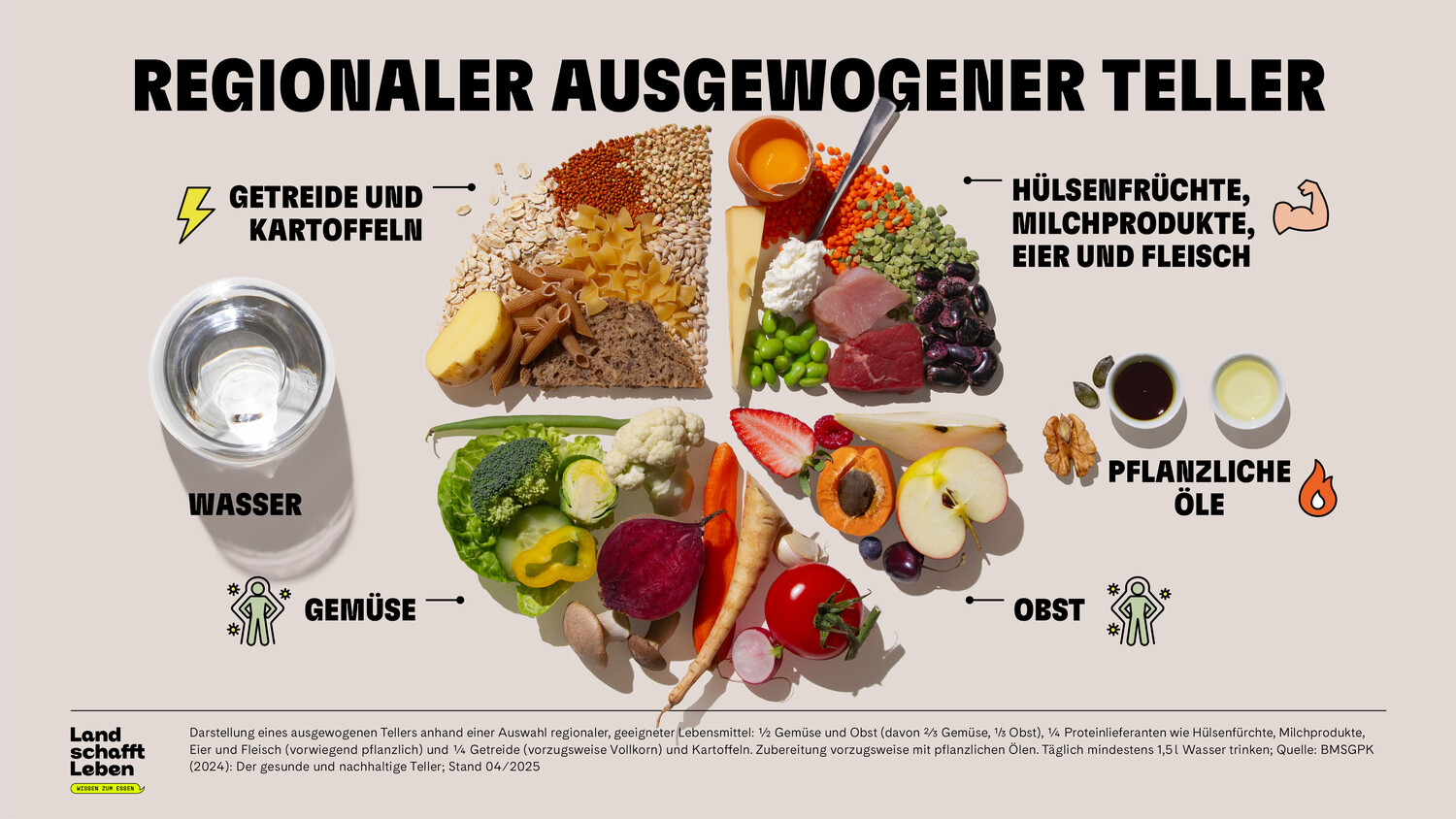 Kartoffeln und Getreide, Proteine aus tierischen und/oder pflanzlichen Quellen, Gemüse und Obst sollten – genauso wie pflanzliche Fette und Wasser – tägliche Bestandteile unserer Ernährung sein. Doch wie sieht eine Mahlzeit, die diesen Kriterien entspricht, im Detail aus? Diese Frage beantwortet das Tellermodell. Es zeigt, welche Verhältnisse bei der Zusammenstellung des Tellers beachtet werden sollten.