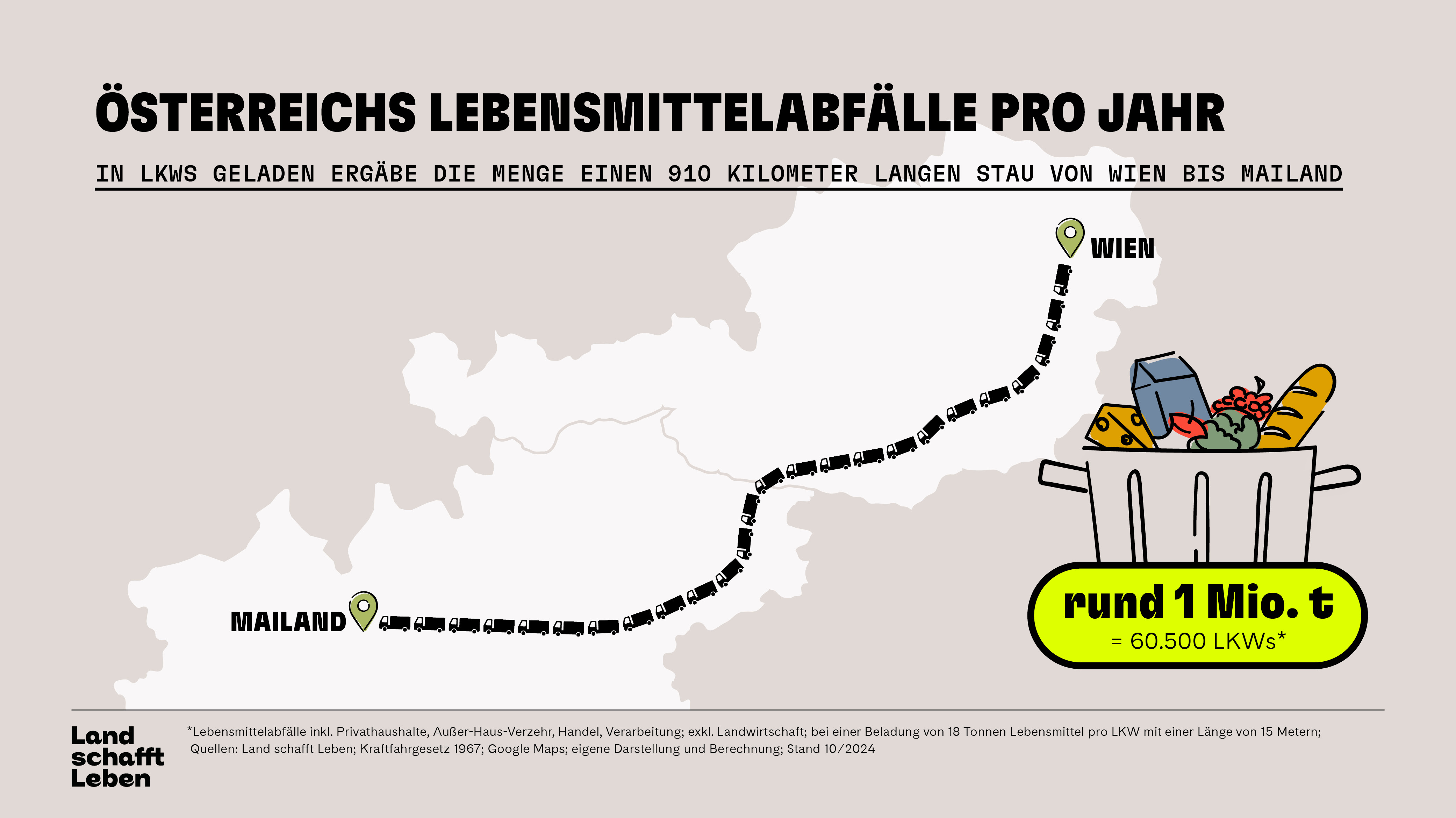 Mit der jährlichen Gesamtmenge unserer Lebensmittelabfälle könnten wir mehr als 60.000 LKWs füllen. © Land schafft Leben