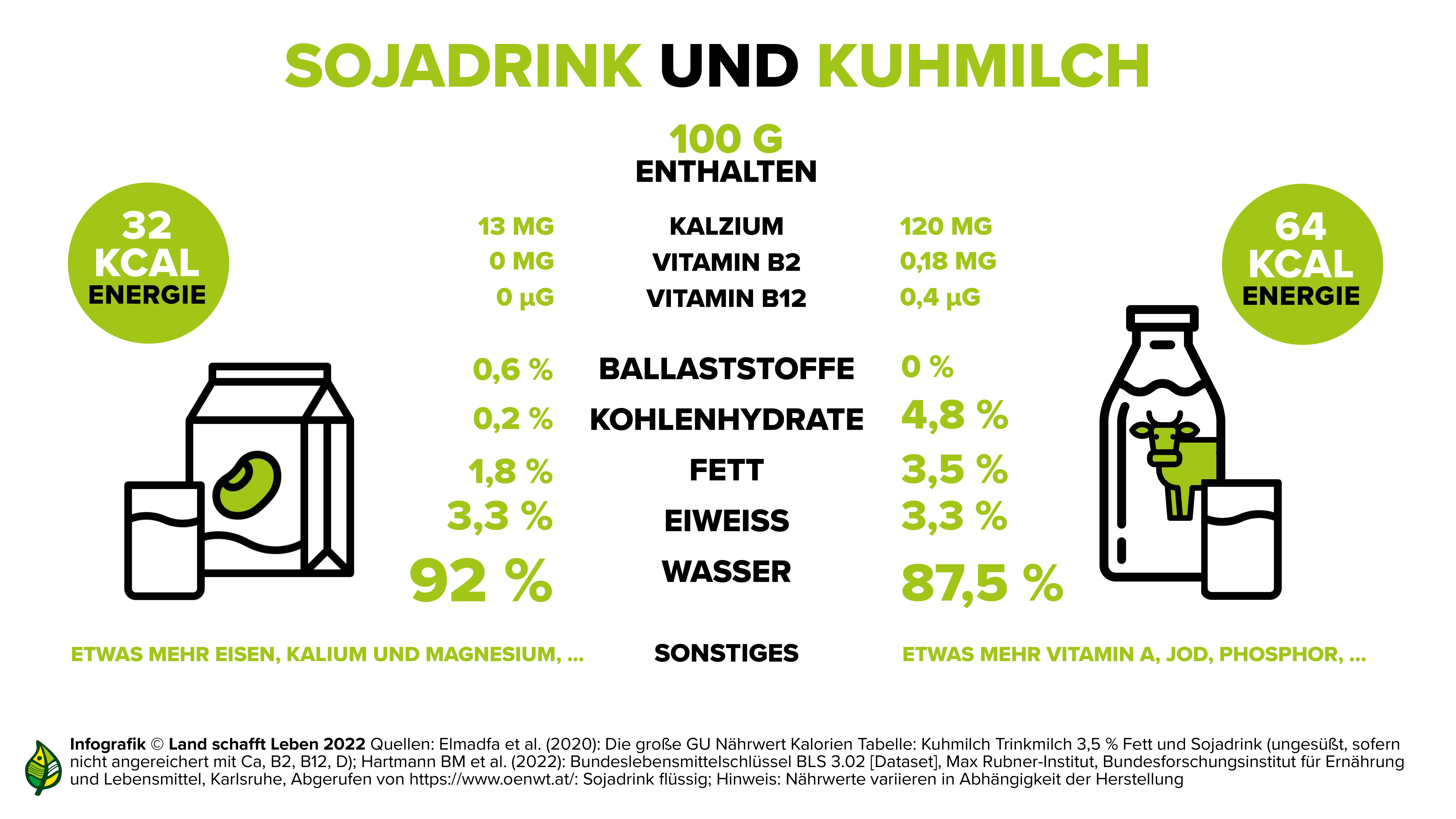 Milch enthält hochwertiges Eiweiß und leicht verdauliches Fett. Außerdem finden sich in Milch die Mineralstoffe Kalzium und Phosphor sowie B-Vitamine und die Vitamine A und D. Die meisten Pflanzendrinks haben natürlicherweise einen geringeren Nährstoffgehalt. Sojadrink, der den gleichen Eiweißgehalt wie Milch aufweist, stellt eine Ausnahme dar. Dieser beträgt bei beiden Lebensmitteln rund drei Gramm pro 100 Gramm Flüssigkeit.