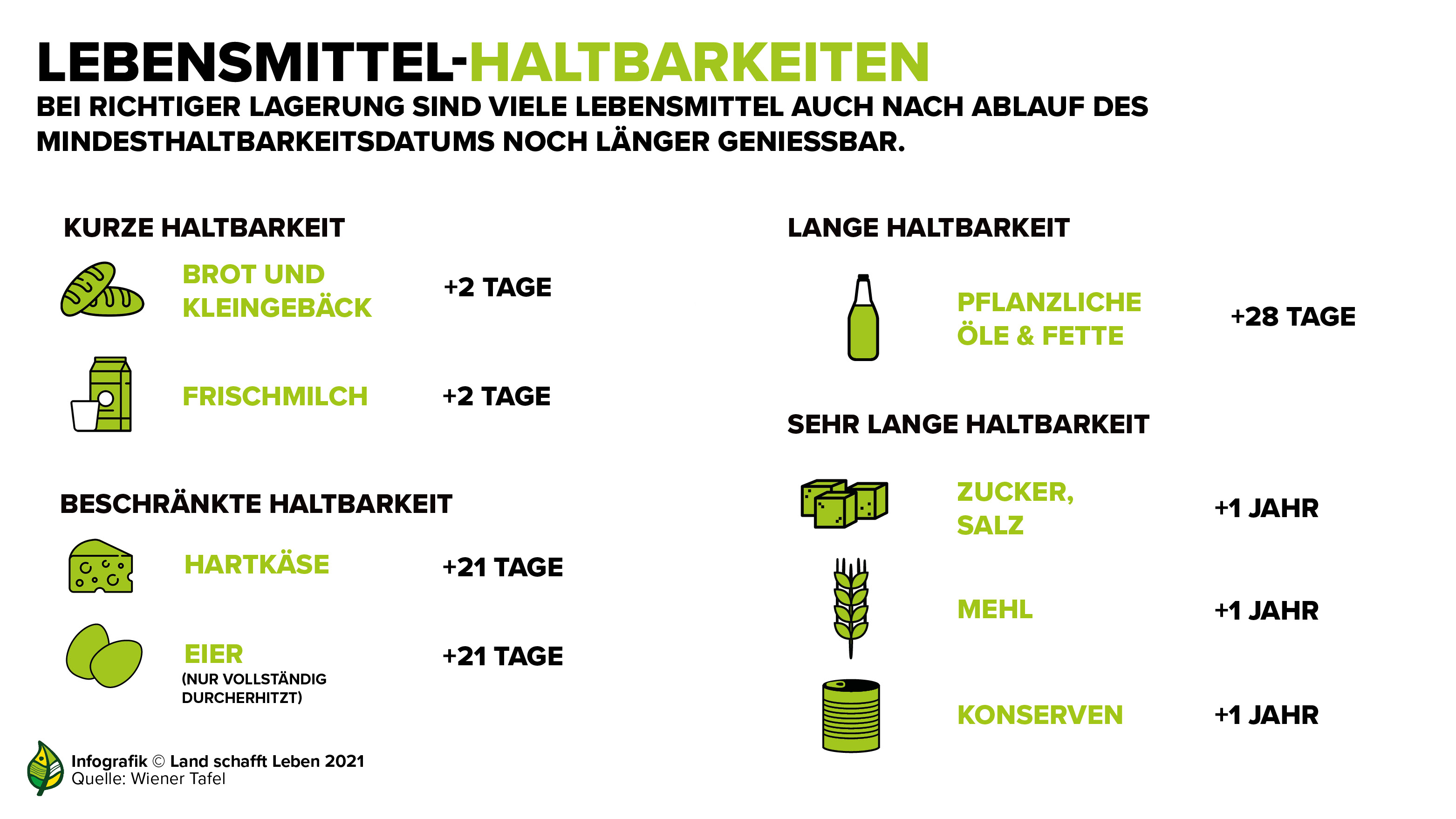 - Infografik Lebensmittelhaltbarkeit: Bei richtiger Lagerung sind viele Lebensmittel auch nach Ablauf des Mindesthaltbarkeitsdatums noch länger genießbar. © Land schafft Leben
