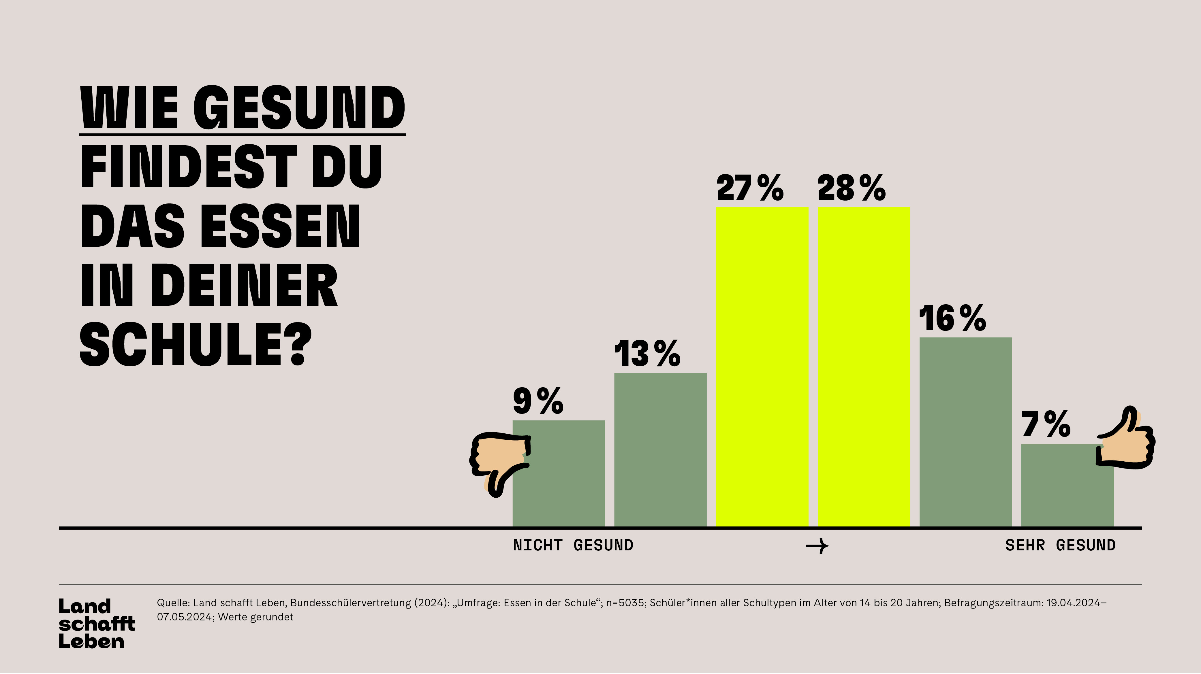 Wie relevant dieses Thema ist, wurde bei einer Online-Umfrage von Land schafft Leben und der Bundesschülervertretung deutlich. Über 80 Prozent der 5.000 befragten Schülerinnen und Schüler geben an, dass ihnen gesundes Essen an der Schule wichtig ist. Rund die Hälfte würde zudem gerne mehr über die Themen Gesundheit und Ernährung erfahren und Kochen im Unterricht lernen. Auch Tierwohl, Landwirtschaft, Lebensmittelverschwendung sowie Essen und Klima interessieren die Befragten. Maria Fanninger sagt dazu: