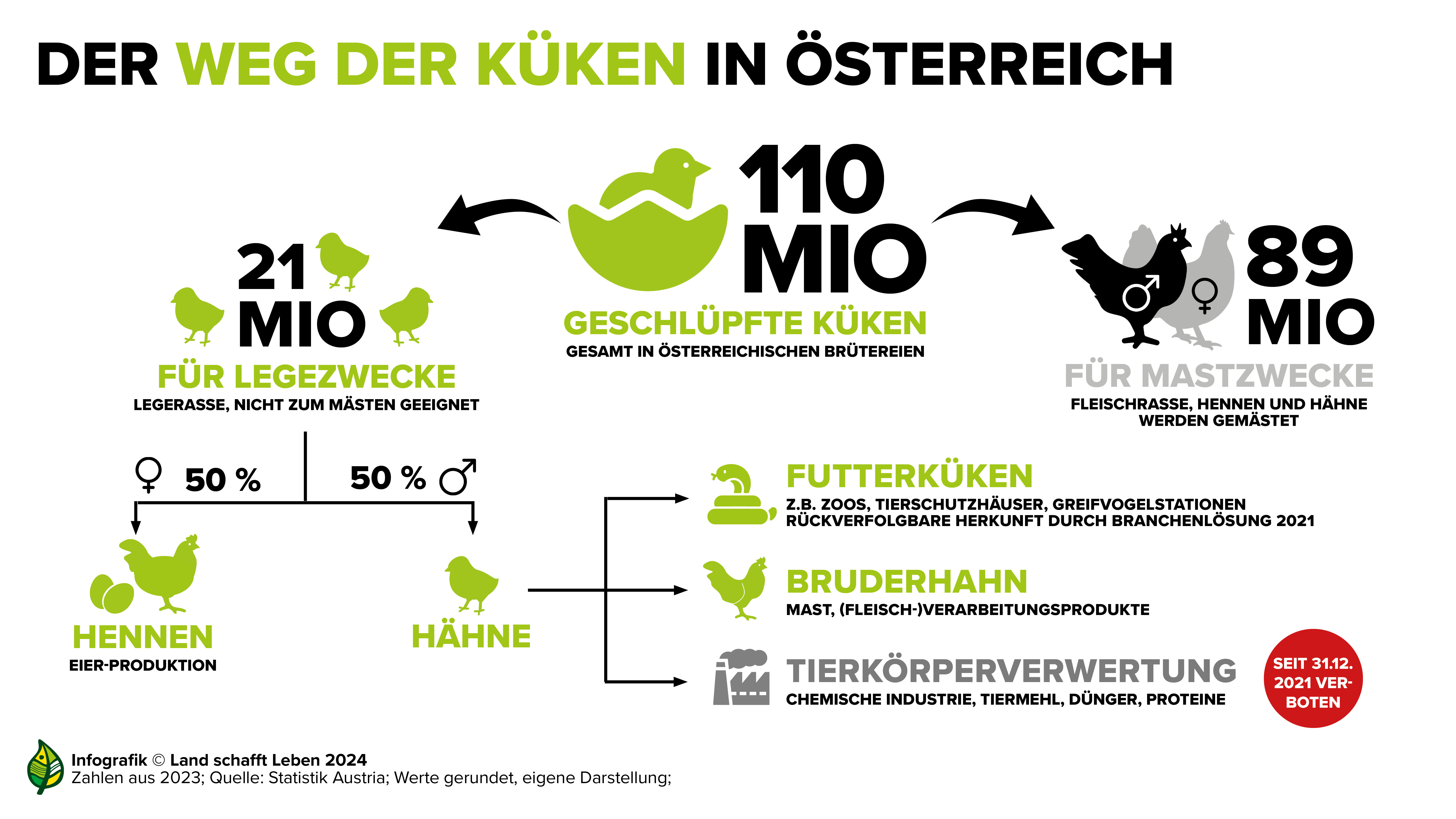 Über sieben Millionen Legehennen leben in Österreich. Die Hähne der Legerassen jedoch können keine Eier legen. In Österreich sieht eine Branchenlösung drei Wege vor, was mit den männlichen Küken passiert. Sie müssen entweder in sogenannten „Bruderhahn“-Programmen aufgezogen oder als Futterküken, etwa für Zoos, verwendet werden. Die dritte Option ist die sogenannte Geschlechterfrüherkennung, die in Österreich aktuell jedoch nicht umgesetzt wird. Dabei wird das Geschlecht des Kükens bereits im Ei festgestellt. Ist es ein Hahn, wird das Ei gar nicht erst fertig ausgebrütet. Hannes Royer, Gründer von Land schafft Leben, sagt dazu: