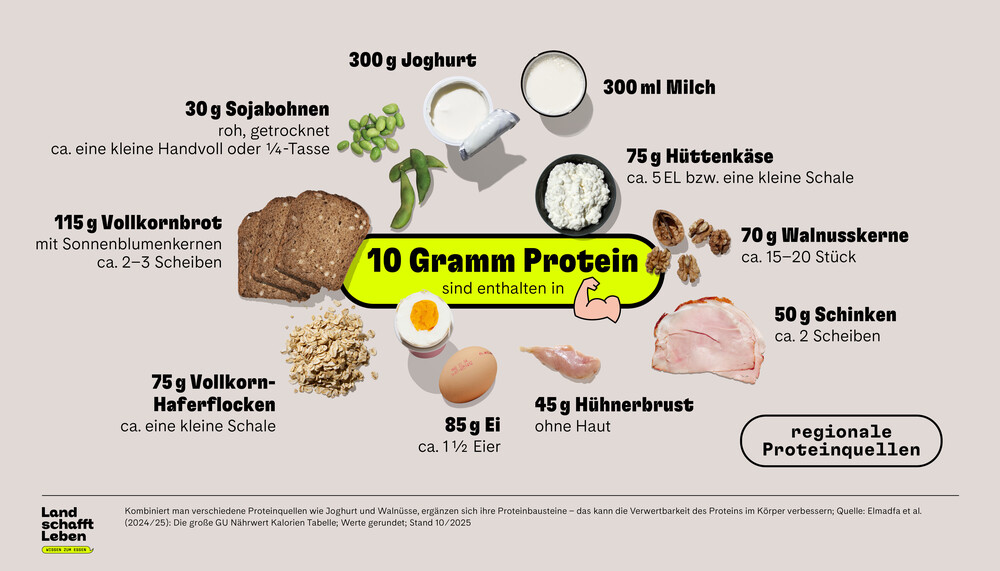 Die Proteinqualität von Lebensmitteln lässt sich etwa auch durch Fermentation steigern. Außerdem kann man mit Sprossen und Keimen die Aufnahme verschiedener Proteinbausteine unterstützen. Der Schlüssel zu einer optimalen Proteinversorgung ist also eine Kombination verschiedener Lebensmittel, wobei diese nicht gemeinsam gegessen werden müssen, sondern auch über den Tag verteilt in den Speiseplan eingebaut werden können: Hier ist tierisches Protein für den menschlichen Körper besonders gut verwertbar und pflanzliche Proteinquellen können einen hochwertigen Beitrag leisten – wie etwa in einem Gröstl aus Kartoffeln und Eiern.