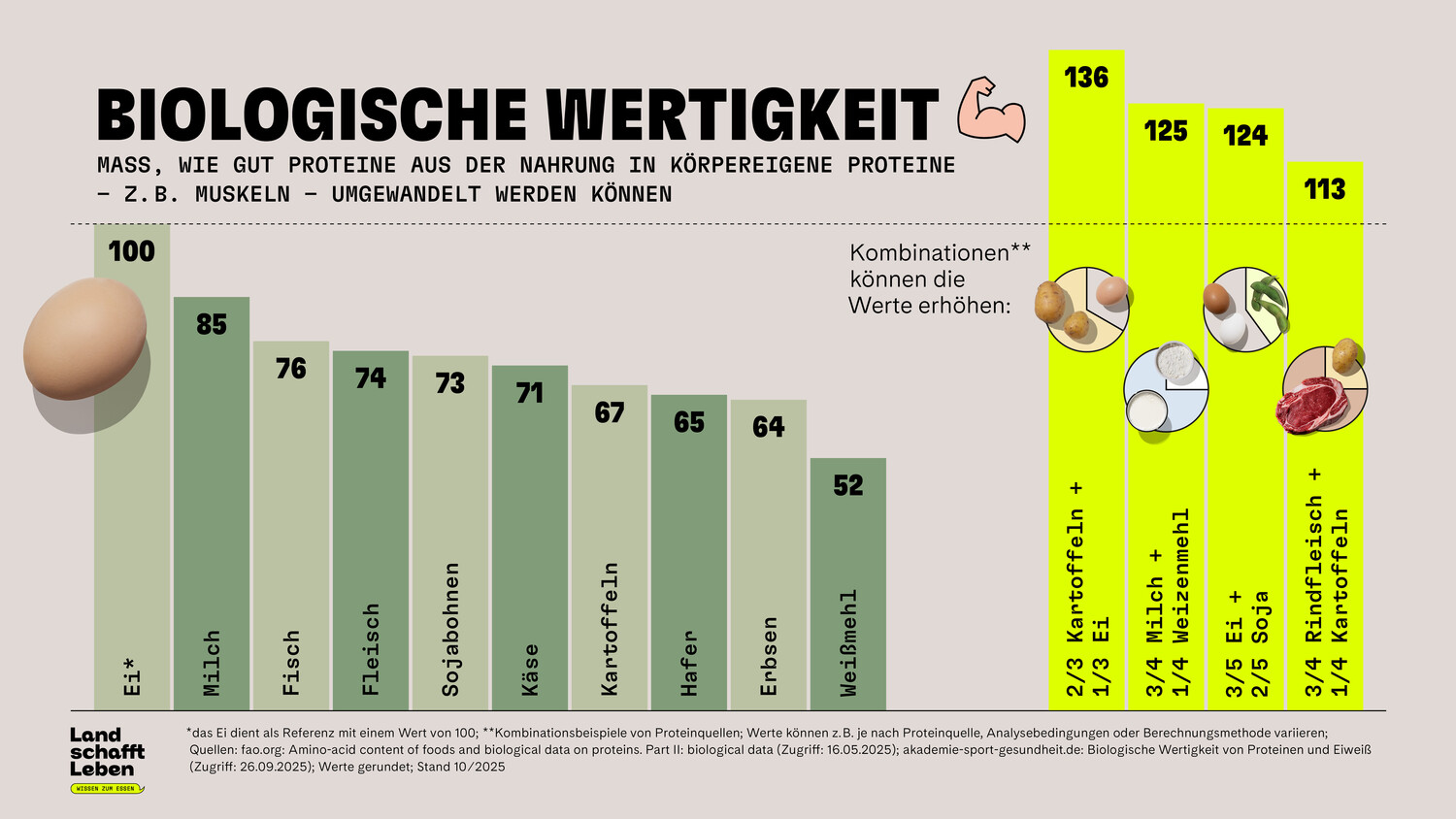 Nicht alle Nahrungsproteine eignen sich gleich gut zum Aufbau von körpereigenem Protein und damit als Bau- und Reparaturstoffe für menschliches Gewebe. Wie gut das Protein aus Lebensmitteln zur Bildung von körpereigenen Proteinen – zum Beispiel in Muskelmasse – genutzt werden kann, gibt die biologische Wertigkeit (BW) an. Als Referenz für die Bewertung dient dabei das Hühnerei: Seine BW wurde als 100 festgelegt. Bei einem Lebensmittel, dessen Protein schlechter verwertet wird als das aus dem Ei, sinkt die BW auf einen Wert unter 100. Es gilt: Je ähnlicher die Zusammensetzung eines Nahrungsproteins dem körpereigenen Protein ist, desto besser kann es verwertet werden. Besonders gut lassen sich Proteine aus tierischen Lebensmitteln wie etwa Milchprodukten, Eiern und Fleisch verwerten. Eine Kombination aus einer Vielfalt verschiedener Proteinquellen (wie einem Frühstück mit Eierspeise und Joghurt als erste Proteinmahlzeit des Tages) macht die Baustoffe für den Körper besonders gut nutzbar. Kombinationen aus Lebensmitteln erhöhen die BW und können den Gesamtwert einer Mahlzeit sogar über 100 steigern: Das kann z. B. eine Speise aus Kartoffeln (65 %) mit Ei (35 %) sein à BW 137, eine Mahlzeit aus Rindfleisch (77 %) und Kartoffeln (23 %) à BW 113 oder man probiert ein Rezept mit Ei (60 %) und Soja (40 %) à BW 122. Viele typisch österreichische Gerichte enthalten mehrere Proteinquellen, wie z. B.: Kartoffelgröstl mit Ei, Salzkartoffeln mit Ei und Spinat oder auch Rindsgulasch mit Kartoffeln. Hier bietet sich eine vielfältige Variation der verschiedenen, proteinhaltigen Lebensmittel unterschiedlichen Ursprungs an. Sie müssen nicht zwingend gemeinsam verzehrt werden: Der Körper kann die verschiedenen Proteinquellen auch dann in Kombination nutzen, wenn sie über den Tag verteilt aufgenommen werden – wie zum Beispiel ein Spiegelei zum Frühstück und ein Gericht mit Soja zum Mittagessen.