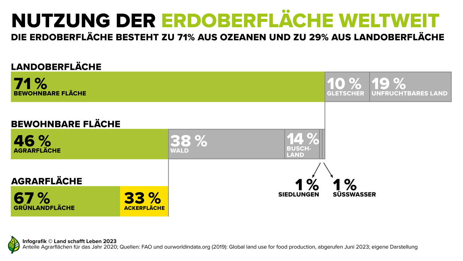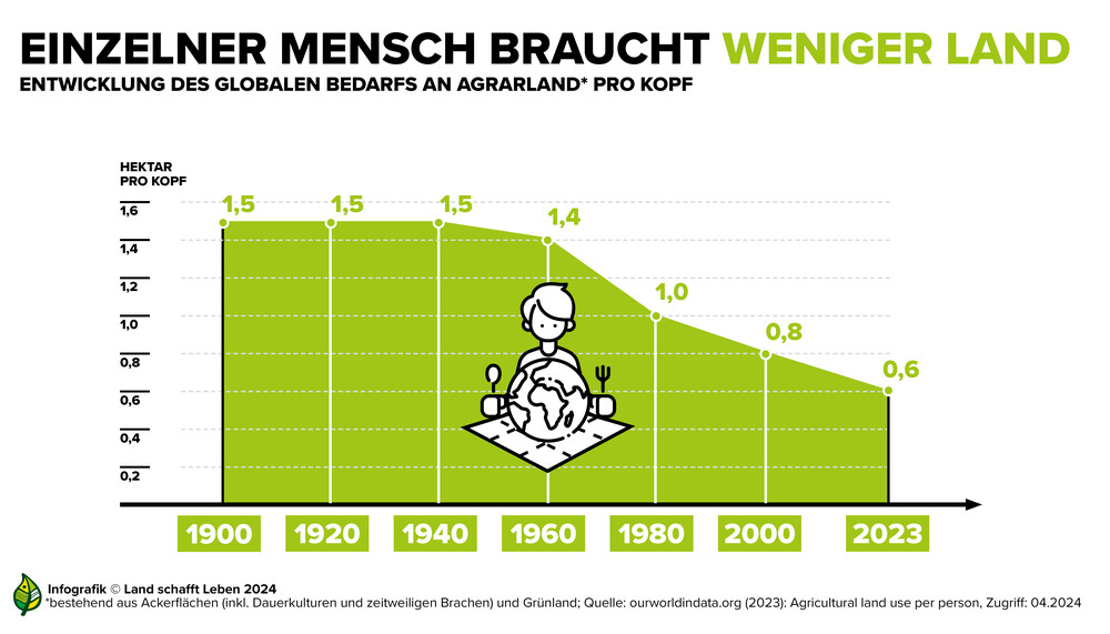 Laut Daten der Weltlandwirtschafts-Organisation FAO machen Agrarflächen bereits fast die Hälfte der bewohnbaren Landoberflächen der Erde aus. Auf diesen wachsen die Pflanzen für die direkte und indirekte menschliche Ernährung (Lebens- und Futtermittel) sowie etwa für die Biosprit-, Baumwoll- oder Hobbytierfutterproduktion heran. Legt man diese gesamte globalen Landwirtschaftsfläche auf alle über 8 Milliarden Menschen um, dann beansprucht jeder davon durchschnittlich 6.000 Quadratmeter (0,6 Hektar), was annähernd der Größe eines Standard-Fußballfeldes entspricht (0,7 Hektar).