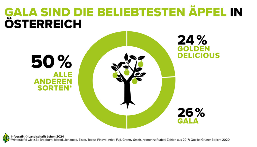 Zwei Sorten werden in Österreich mit Abstand am meisten angebaut, Golden Delicious und Gala. Bei der Anzahl der Bäume kann Gala noch mithalten, die Geschichte vieler Sorten zeigt aber die wahre Vorherrschaft von Golden Delicious. Bei der Züchtung von Gala, Jonagold, Elstar, Pinova, Arlet und Fuji – die alle in den Top 10 zu finden sind – wurde Golden Delicious eingekreuzt.