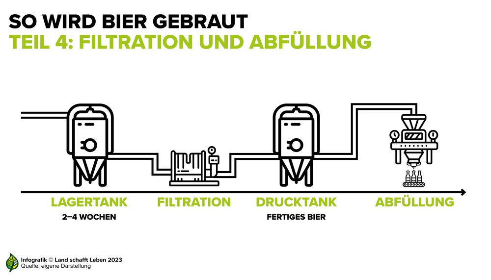 Nach der Gärung wird das Bier vier bis sechs Wochen gelagert. Das hat unterschiedliche Zwecke. Das Bier klärt durch natürliches Absetzen der Trübstoffe, die verbleibende Hefe kann die Gärnebenprodukte abbauen, feine Kohlensäure bildet sich, das Bier reift geschmacklich und klärt auf natürliche Weise. Damit sich das Bier klären und die Kohlensäure im Bier gebunden werden kann, muss die Temperatur sehr kühl sein. Da Bier erst bei minus 2,5 Grad gefriert, darf es auch knapp unter null Grad haben.