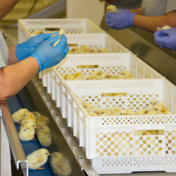 In der Brüterei ist Hygiene sehr wichtig. Krankheiten würden in den Junghennenaufzucht- und Legehennenbetrieb weitergetragen werden. Aus etwas etwa 82 Prozent der Eier schlüpfen Küken. Die restlichen Eier werden entsorgt. Die Küken werden am Tag des Schlüpfens mit Förderbändern von einer Station zur nächsten transportiert. Die eine Hälfte der Küken ist männlich, die andere weiblich. Mitarbeiter der Brüterei sortieren die männlichen Küken aus. Sie werden mit Ausnahme der für die Bio-Landwirtschaft bestimmten Küken gleich getötet. Die weiblichen Küken werden in einem klimatisierten LKW zum Junghennenaufzuchtbetrieb transportiert. Schon in wenigen Jahren könnte eine Technologie zur Anwendung kommen, die das Geschlecht bereits im Ei erkennt und männliche Eier aussortiert. Dann müssten keine männlichen Küken mehr getötet werden.