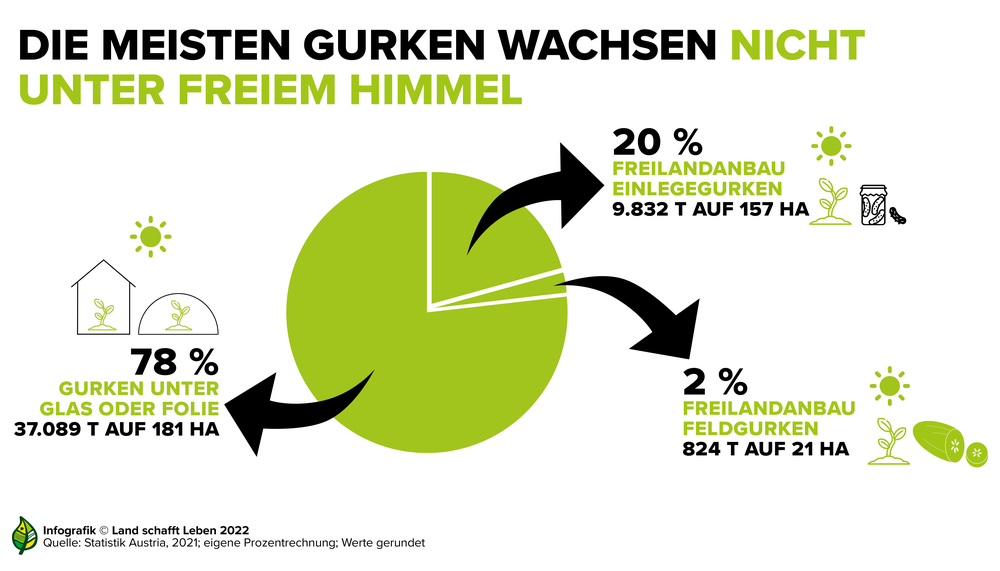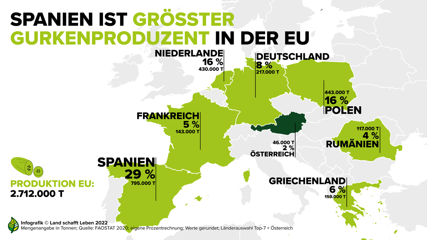 Nur Tomaten, Zwiebeln, Karotten und Salat kaufen wir Österreicherinnen und Österreicher in größeren Mengen als Gurken. Kartoffel sind in dieser Statistik nicht enthalten, davon kaufen wir noch mehr. Mit großem Abstand weltgrößter Gurkenerzeuger ist China, alle Gurkenarten, also Salat- und Einlegegurken, werden hier zusammengerechnet.