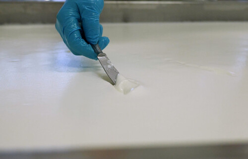 Anhand einer Messerprobe kann die Käserin beziehungsweise der Käser prüfen, ob die Gallerte bereits dick genug ist. Eine glatte Bruchstelle ist ein gutes Zeichen, denn nun kann sie geschnitten werden.