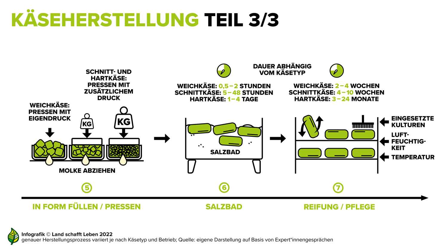 Nach dem Salzbad kommt der Käse in den sogenannten Reifekeller. Je nach Käsetyp und -sorte herrscht dort eine bestimmte Temperatur und eine relative Luftfeuchtigkeit. Ebenso vom Käsetyp abhängig ist die Reifungsdauer: Frischkäse reift gar nicht, Weichkäse zwischen zwei bis vier Wochen, Schnittkäse ungefähr vier bis zehn Wochen und Hartkäse kann schon mal bis zu sechs Monate oder gar Jahre im Reifekeller liegen. Generelle Regeln sind schwer auszumachen – lediglich eine ist unbestritten: Je härter der Käse, desto länger ist er gereift. Teilweise gibt aber auch der österreichische Lebensmittelkodex Richtlinien vor – so muss etwa ein Bergkäse mindestens drei Monate reifen.