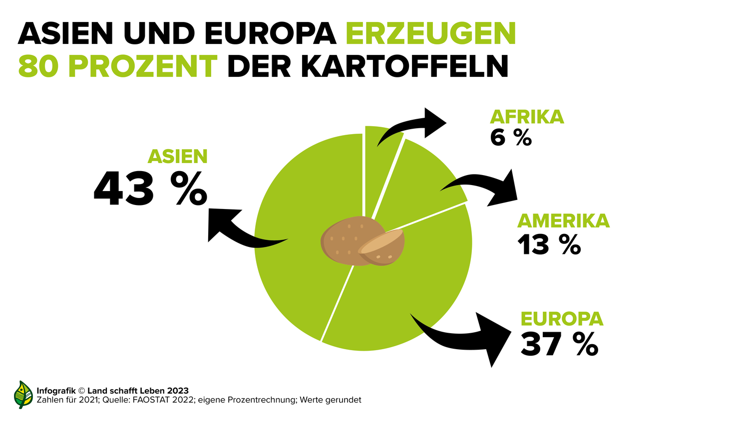 Die meisten Kartoffeln kommen aus Asien und Europa. Im Länderranking liegen die bevölkerungsreichsten Länder China und Indien vorne. Pro Einwohner erzeugen wir Europäer mit Abstand die meisten Kartoffeln.