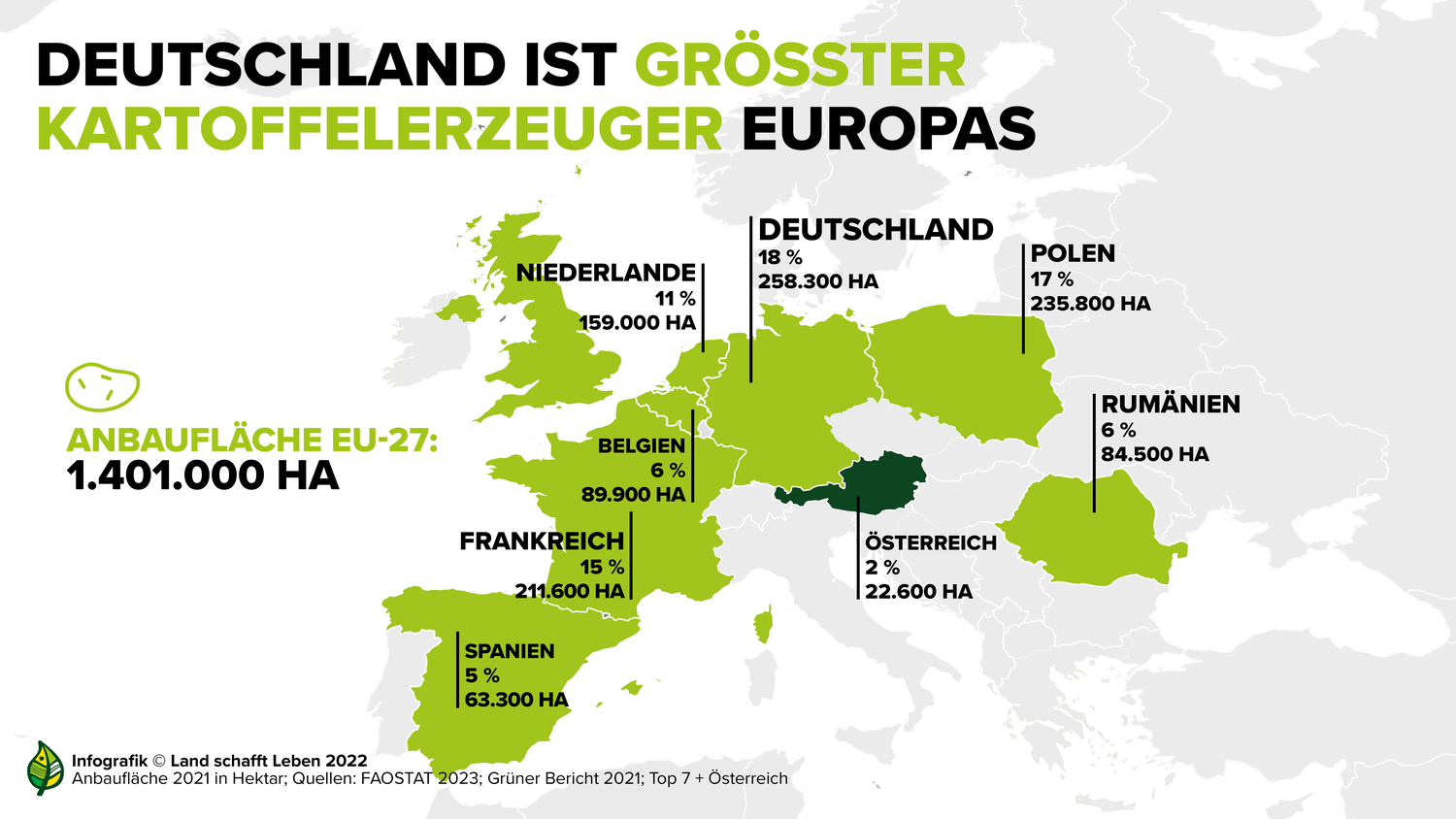 Die weltweite Pro-Kopf-Erzeugung liegt bei rund 48 Kilo pro Jahr. In der EU wurden 2016 etwas mehr Kartoffeln erzeugt als die Bevölkerung konsumierte. Die Unterschiede zwischen den Hektarerträgen waren groß. Rumänien erntete 2022 rund 17 Tonnen pro Hektar, während Deutschland und die Niederlande auf über 42 Tonnen kamen. Österreich verzeichnet in dieser Statistik einen Hektarertrag von rund 34 Tonnen im Jahr 2022. Belgien und Luxemburg sind führend in der Verarbeitung, haben aber eher geringe Anbauflächen. Die Menschen in Zypern verbrauchen die meisten, jene in Bulgarien die wenigsten Kartoffeln und Kartoffelprodukte in der EU.