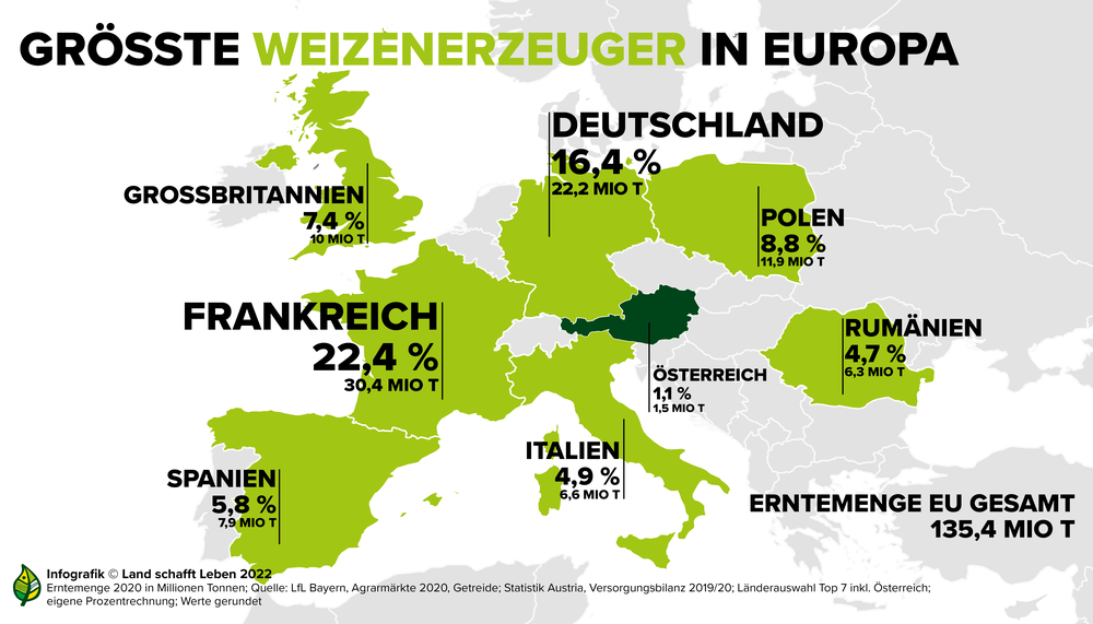 Sieht man sich die österreichische Versorgungsbilanz für Weizen an, so wird schon auf den ersten Blick klar, dass sehr viel Weizen aus Österreich hinaus und auch hereintransportiert wird. Die eigene Erzeugung beträgt 1,2 Millionen Tonnen Weizen. Österreich importiert nahezu die gleiche Menge aus dem Ausland und exportiert rund 0,9 Millionen Tonnen.