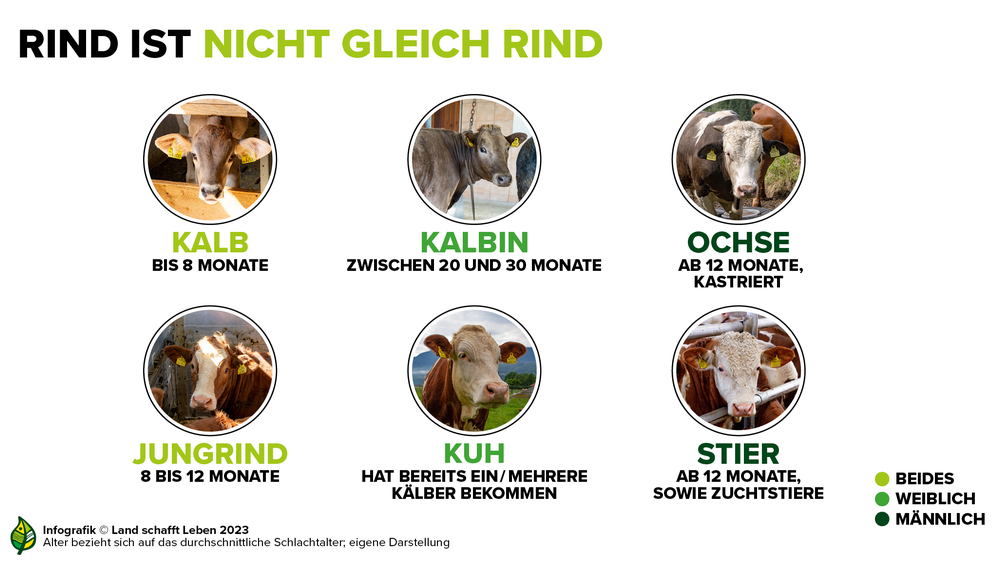 Wann ein Rind geschlachtet wird, hängt zunächst einmal von der Tierkategorie und der entsprechenden Vermarktung ab. Will die Landwirtin oder der Landwirt Kalbfleisch verkaufen, so schlachtet sie beziehungsweise er das Tier logischerweise deutlich früher, als wenn er oder sie beispielsweise Jungstierfleisch verkauft. In welchem Alter Kalb, Jungstier, Ochse und Co. in der Regel geschlachtet werden, erfährst du hier. So ganz pauschal kann man diese Aussage allerdings nicht treffen, denn auch das Qualitätsprogramm, in dessen Rahmen das Tier vermarktet wird, spielt beim Schlachtzeitpunkt eine Rolle. So muss ein Kalb rosé-Kalb etwa zwischen sechs und acht Monate alt sein, wenn es geschlachtet wird, ein AMA-Vollmilchkalb hingegen darf nur maximal sechs Monate alt sein, um als solches vermarktet werden zu dürfen.