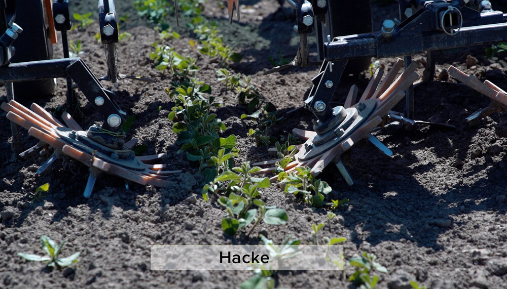 Im Bio-Bereich werden Unkräuter mechanisch mit Striegel und Hacke bekämpft – die Anwendung von Herbiziden ist nicht erlaubt. Wegen des langsamen Wachstums von Soja, müssen Bio-Bäuerinnen und -Bauern ihre Felder mehrmals mit den entsprechenden Maschinen befahren. Um das Hacken zu erleichtern, ist eine gerade Anbaureihe wichtig, sodass das Gerät möglichst keine Sojapflanzen ausreißt, sondern nur Unkraut. Anfangs striegeln die Bäuerinnen und Bauern meist, wenn die kleinen Sojapflanzen noch nicht sichtbar aus dem Boden sprießen. Diese Methode nennt sich Blindstriegeln. Wenn sich die ersten Blätter gebildet haben, kann wieder gestriegelt werden. Danach wird neu aufkommendes Unkraut mit der Hacke bekämpft.