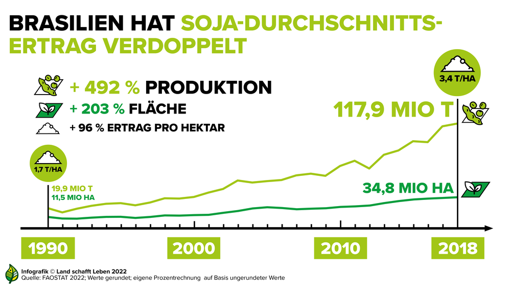 Seit den 1960er Jahren hat die allgemeine Modernisierung der Landwirtschaft bei den wichtigsten Kulturen zudem enorme Steigerungen der Erträge pro Hektar gebracht und damit das Wachstum der Weltbevölkerung von rund drei Milliarden 1960 auf 7,7 Milliarden im Jahr 2019 mitermöglicht. In Kombination mit der Ausdehnung der Anbaufläche hat dies bei Sojabohnen dazu geführt, dass die Weltlandwirtschaft heute eine 13-mal größere Sojabohnenmenge erntet als 1961. Die Produktion wuchs von rund 27 Millionen Tonnen 1961 auf 349 Millionen Tonnen im Jahr 2018 und 353,5 Millionen Tonnen im Jahr 2020. Fast 85 Prozent der Menge wachsen in Nord- und Südamerika.