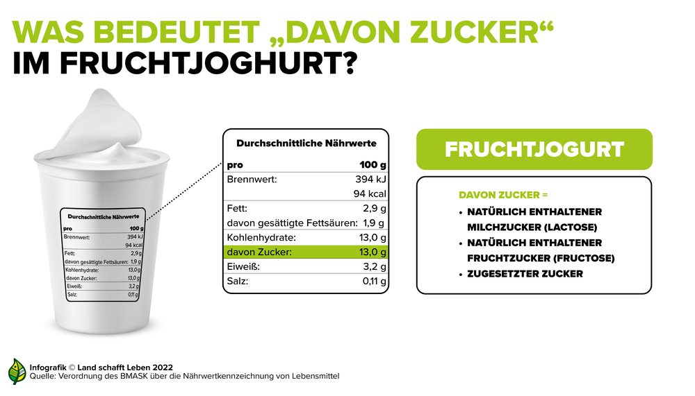 In Fruchtjoghurt findet man in der Nährwerttabelle unter dem Begriff “davon Zucker” einerseits den von Natur aus enthaltenen Milchzucker und den von Natur aus enthaltenen Fruchtzucker aus den zugesetzten Früchten. Und andererseits den zugesetzten Zucker. In welcher Menge Zucker zugesetzt wurde und in welcher Menge Milch- und Fruchtzucker enthalten ist, erfährt man an dieser Stelle nicht.