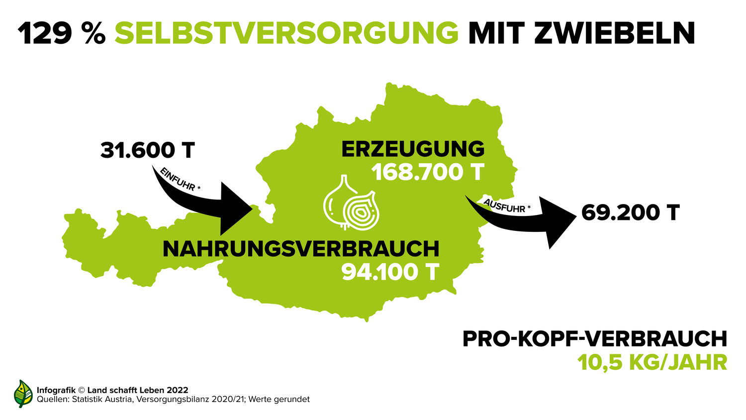 Österreichs Klima eignet sich sehr gut für den Zwiebelanbau. Die Bauern erzeugen so viel, dass etwa zwei Fünftel exportiert werden müssen. Länder in Südost- und Osteuropa sind die Hauptabnehmer. Wie gut die Ernte ausfällt, hängt von natürlichen Faktoren wie dem Wetter ab. Die Schaderreger sind Pilze und Insekten, ihre Vernichtung erfolgsentscheidend. Die Bauern dürfen nur bestimmte, in Österreich zugelassene Pflanzenschutzmittel ausbringen. Bio-Bauern ernten im Schnitt um die Hälfte weniger pro Hektar, vor allem, weil sie keine chemisch-synthetischen Pflanzenschutzmittel einsetzen.