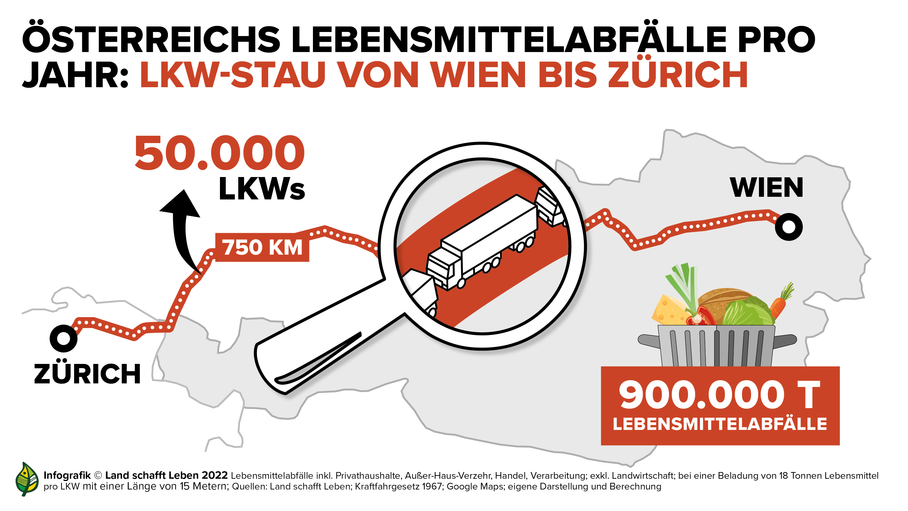 Um die jährlich in Österreich anfallenden Lebensmittelabfälle zu transportieren, bräuchte man 50.000 LKWs. Aneinandergereiht würden diese einen Stau von Wien bis Zürich bilden. © Land schafft Leben, 2022