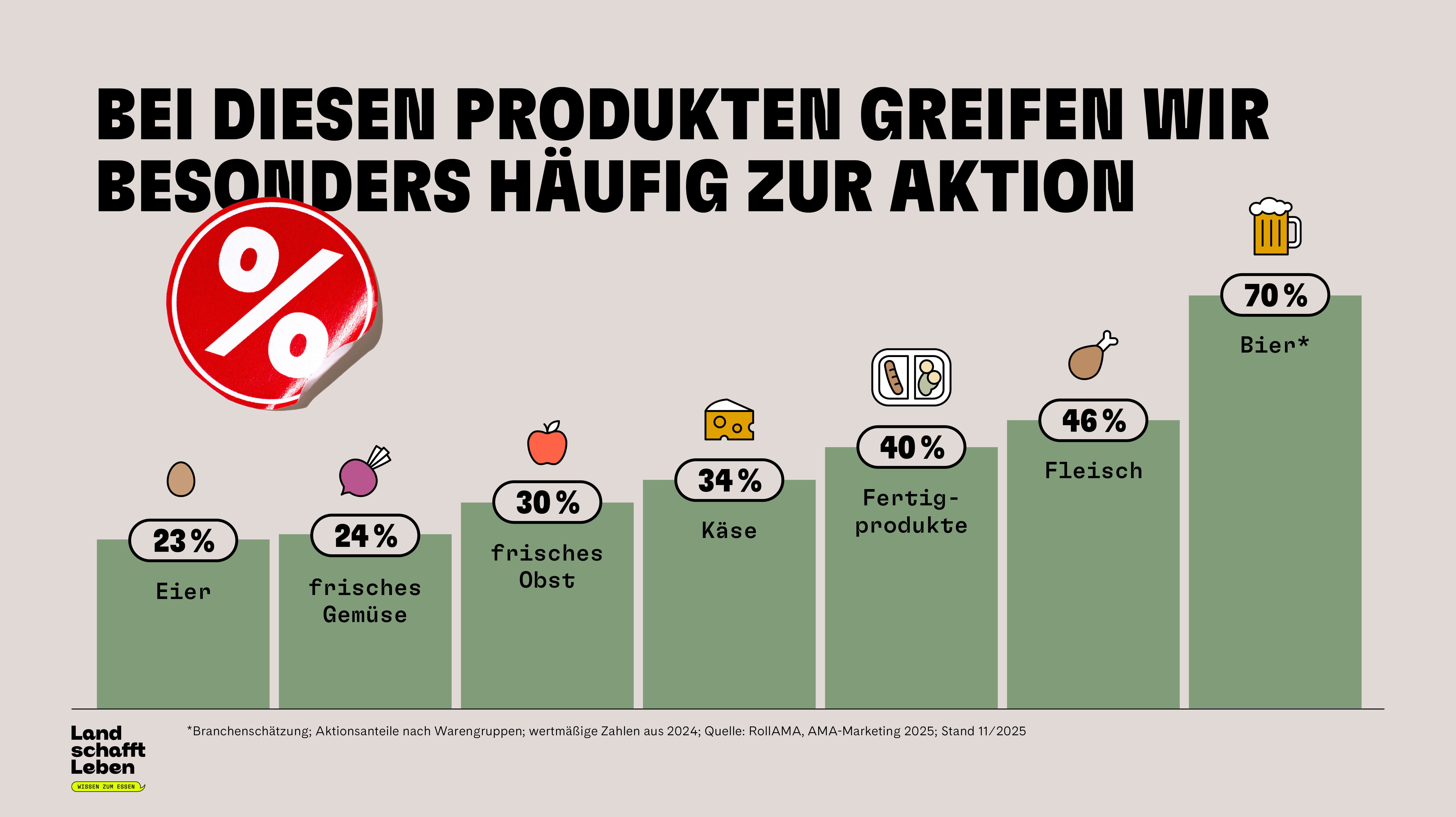 Vor allem Bier, aber auch Fleisch und Fertiggerichte kaufen Konsumentinnen und Konsumenten besonders häufig in Aktion. © Land schafft Leben