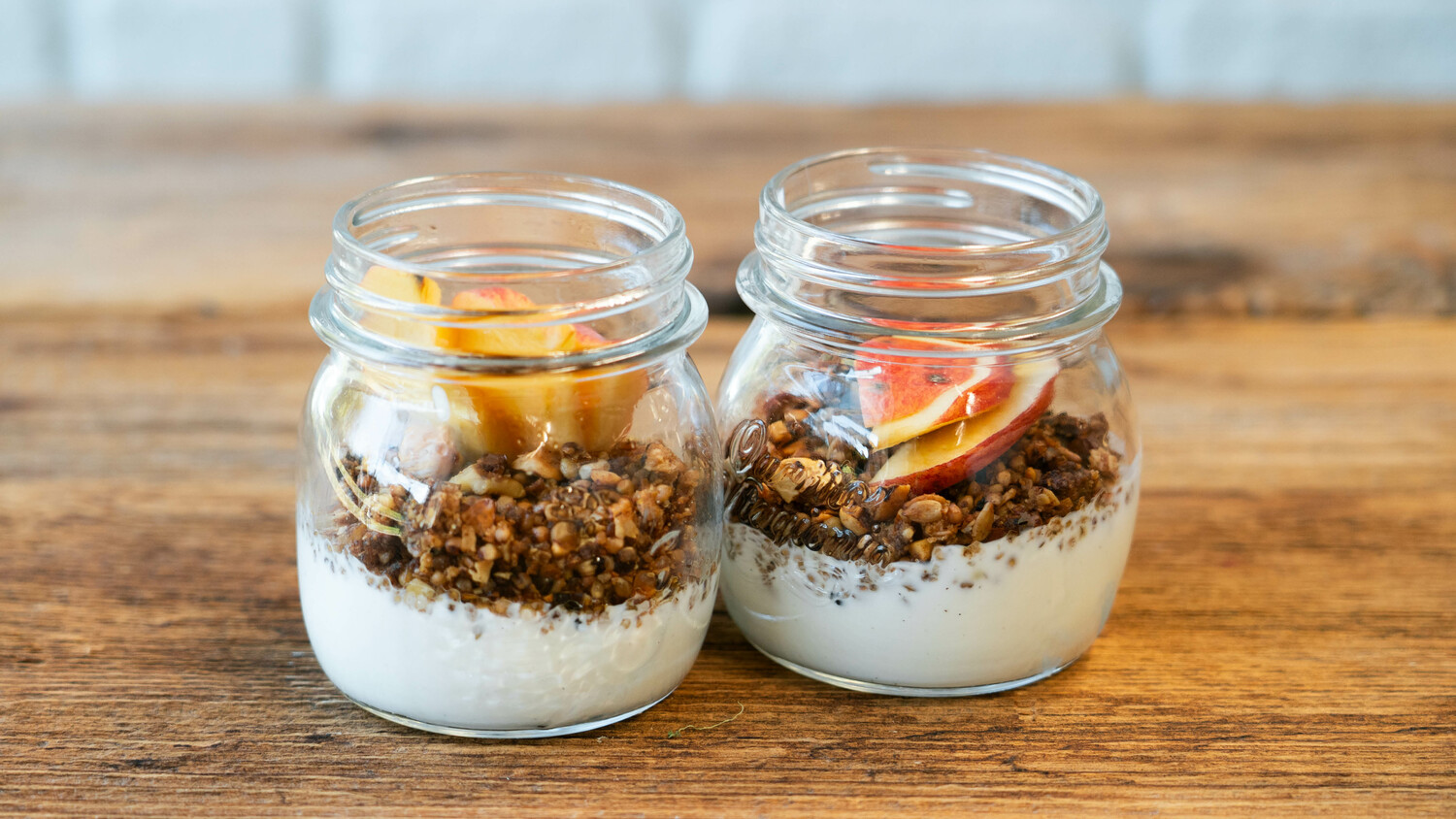 Zum Servieren: Joghurt und Früchte in tiefen Schüsseln oder Gläschen anrichten, mit einigen Esslöffeln Granola und mit etwas Honig garniert servieren.