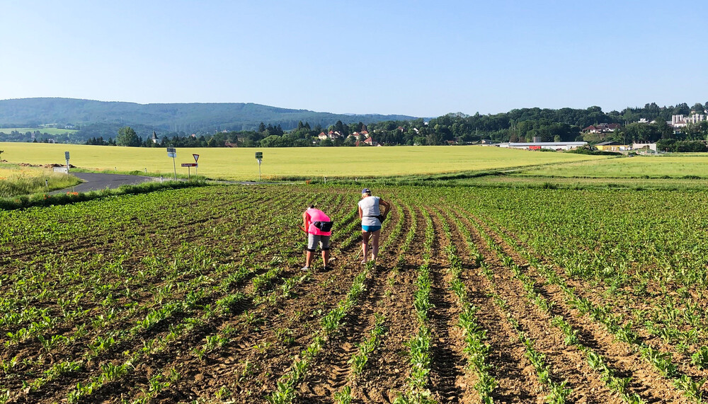 „Spätestens am dritten Tag hätte ich aufgegeben“, sage ich zu meiner Kollegin am Montagmorgen im Land schafft Leben-Büro und lache. Ich zeige ihr meinen roten Rücken und meine mit Blasen versehenen Hände. Vor ihr gebe ich ganz offen zu, dass „nur“ zwei Tage Erntehelfen am Bio-Zuckerrübenfeld sogar mich als Sportlerin an meine Grenzen gebracht haben. Wobei man hier auch mal eines klarstellen muss: „Erntehelfen“ klingt wesentlich idyllischer als es eigentlich ist! Anstatt zu ernten, steht man mit der Hacke am Feld und jätet Unkraut in der prallen Sonne. Anstatt zu „helfen“, was ja eher nach „so ein bisschen Mitarbeiten“ klingt, arbeitet man so hart, dass man abends sogar fast schon zum Essen zu müde ist. Aber zurück zum Anfang meiner Geschichte als Erntehelferin für zwei Tage am Zuckerrübenfeld in Niederösterreich: