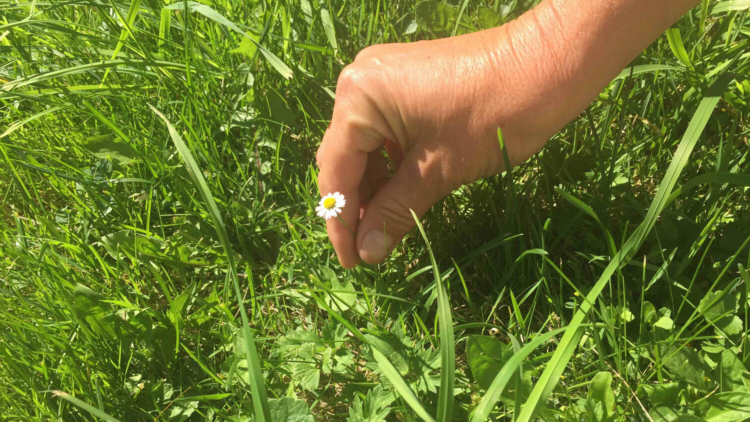Kaum aus der Haustür raus, kniet sich Helga schon nieder und pflückt die ersten Löwenzahnblätter. Ich bin etwas überrascht, dass es tatsächlich so ist, wie eingangs von ihr beschrieben. Helga läuft durch den Garten, entdeckt die verschiedensten Gräser und Blumen, die für Nichtkenner wie mich einfach nur grün und nach ganz normaler Wiese aussehen. (Die einzigen Blumen, die ich erkenne, sind die Gänseblümchen.)