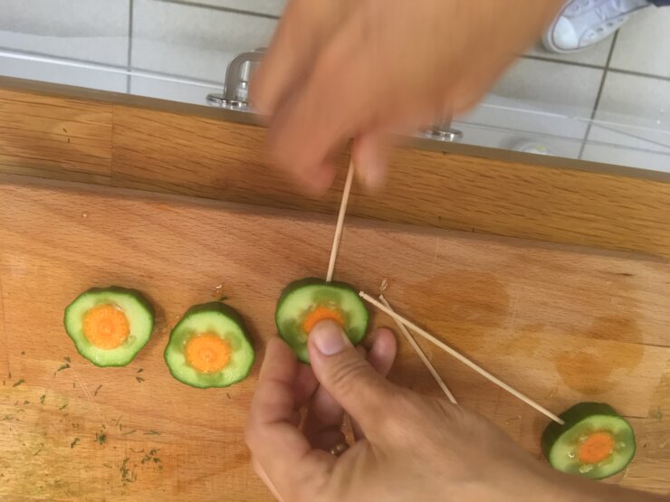 Die Enden der Gurke abschneiden und die Gurke in der Mitte in 2 Teile schneiden. Von der Mitte weg vorsichtig eine nicht zu dicke Karotte durch den Kernteil schieben. Die so „gefüllte“ Gurke kann anschließend in dicke Scheiben geschnitten und auf Spieße gesteckt werden. Ein beliebter Snack für Kinder.