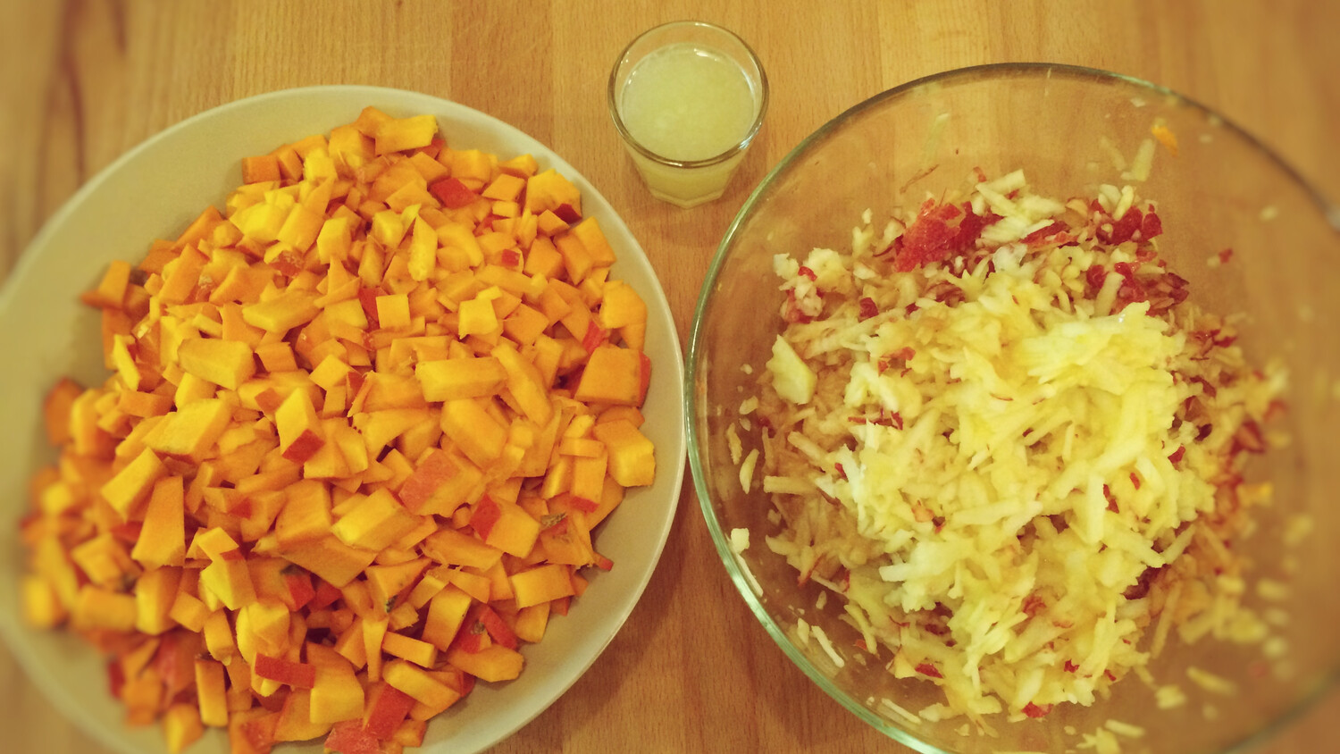 2. Die Kürbisstücke mit ganz wenig Wasser (wirklich nur einen Schuss) ca. 10 min dünsten. Während der Kürbis vor sich hin dünstet, die Äpfel grob reiben.