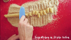 - Danach etwa 1cm breite Stücke mit der Teigkarte abstechen und kleine Kügelchen formen und aufs Backblech legen.