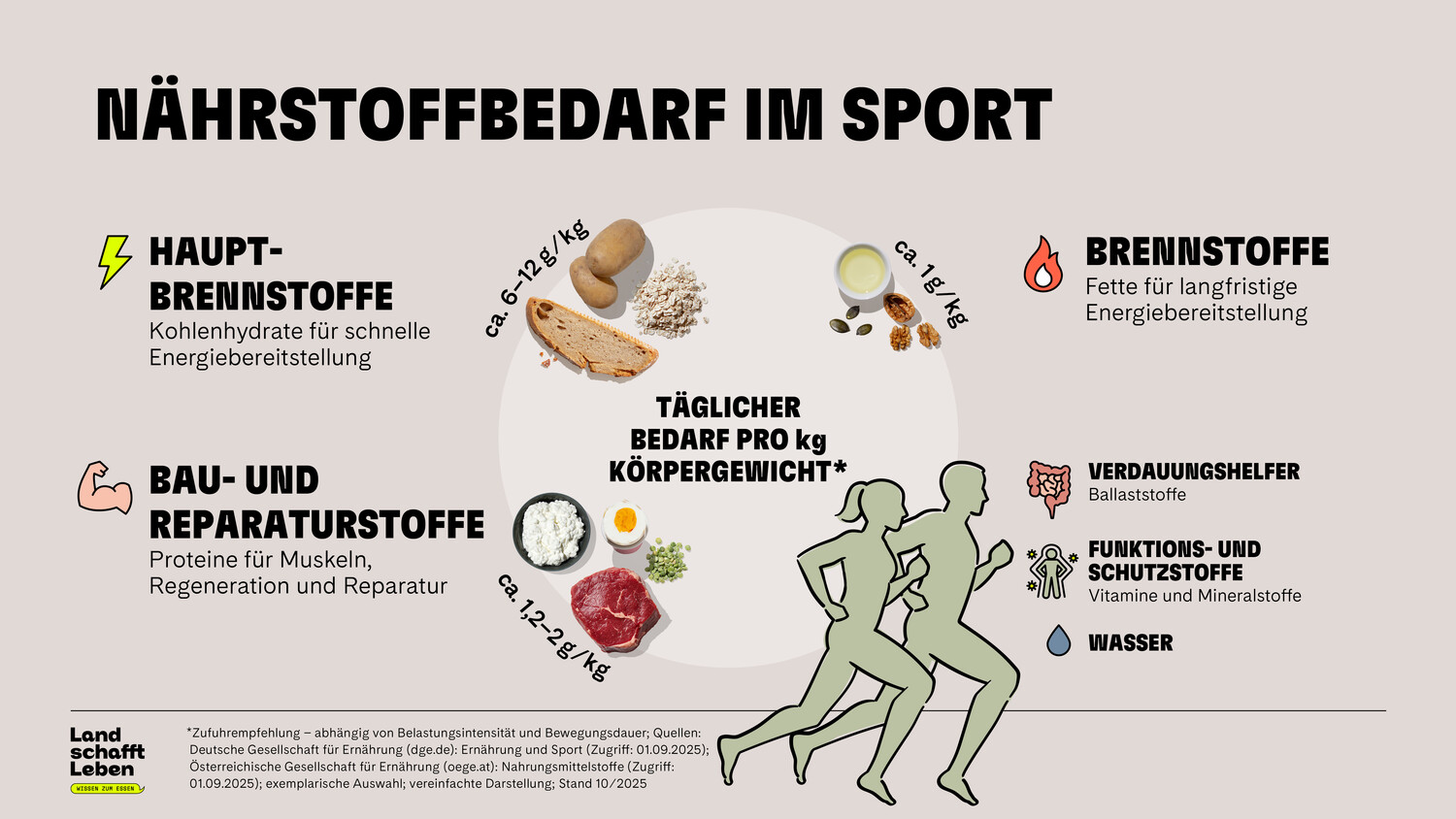 Zwischen den Trainingseinheiten ist eine dem Alltag angepasste Basisernährung wichtig – nicht nur für Fußballprofis, sondern für jede und jeden. Das Tellermodell bietet Orientierung. Darauf befinden sich vielfältiges Gemüse und Obst, Brennstoffe in Form von Getreideprodukten, Kartoffeln und vorrangig pflanzlichen Ölen und Baustoffe aus Eiern, Milchprodukten, Fleisch, Fisch und Hülsenfrüchte^n. Zusätzlich gilt „Kauen vor Trinken“, da gründliches Kauen die Verdauung – auch von Proteinen – optimal vorbereitet. Der Körper kann die Proteine so gut verwerten, beispielsweise für den Aufbau und Erhalt von Muskelmassen.