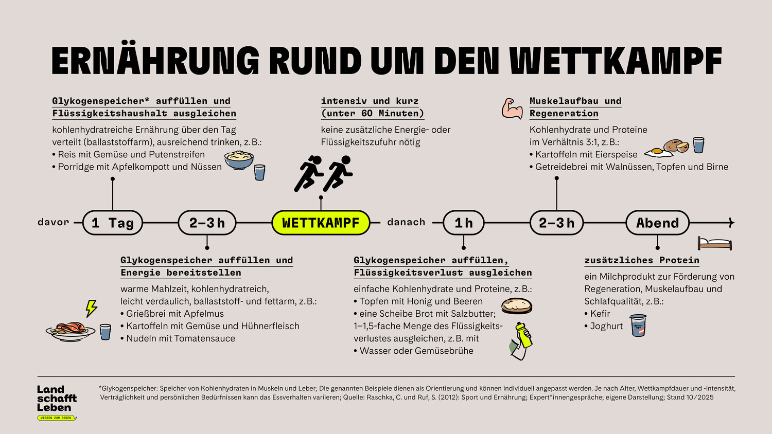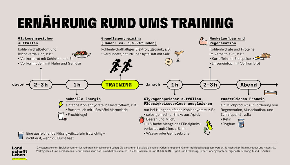 Ein bis drei Stunden vor dem Training oder Wettkampf wird eine kohlenhydratreiche Mahlzeit empfohlen. Kartoffeln mit Gemüse und Hühnerfleisch oder Nudeln mit Tomatensauce helfen zum Beispiel den Glykogenspeicher aufzufüllen. Schnelle Energie direkt vor dem Spiel liefert etwa eine Buttermilch mit einem Esslöffel Marmelade oder ein Fruchtriegel. Wenn beispielsweise Fußballerinnen und Fußballer mit leeren Energiespeichern in ein Spiel starten, kann das ihre Laufdistanz und -geschwindigkeit im Match beeinträchtigen. Zwei Stunden vor der sportlichen Belastung sollten aber keine Ballaststoffe, zum Beispiel aus Vollkornprodukten, mehr gegessen werden – sie beanspruchen die Verdauung und kommen erst nach dem Spiel wieder auf den Teller.