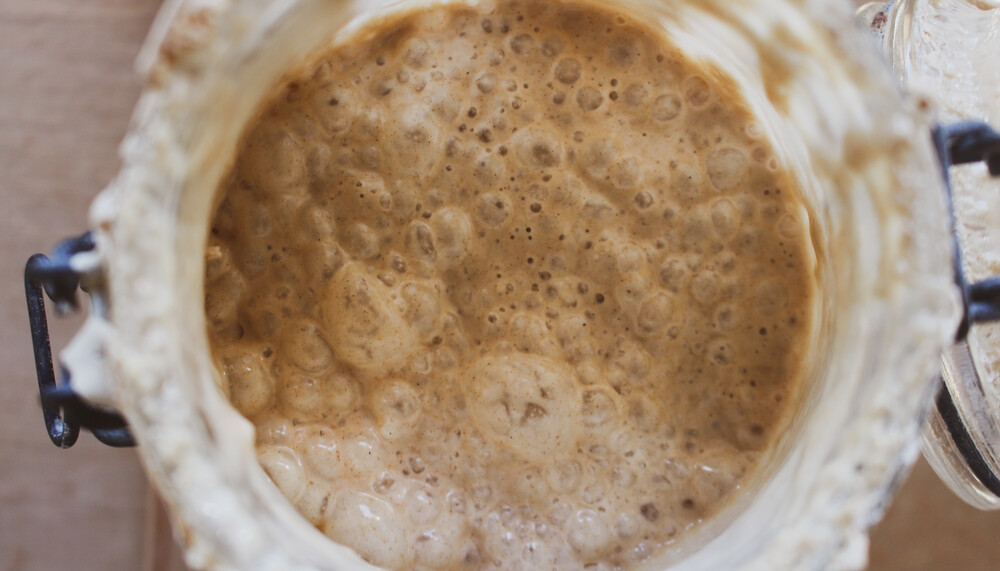- bis 5. Tag: tägliche Wiederholung dieser Prozedur. In dieser Zeit beginnt der Teig zu „blubbern“. Er entwickelt einen angenehm säuerlichen Duft und hat eine breiige Konsistenz.