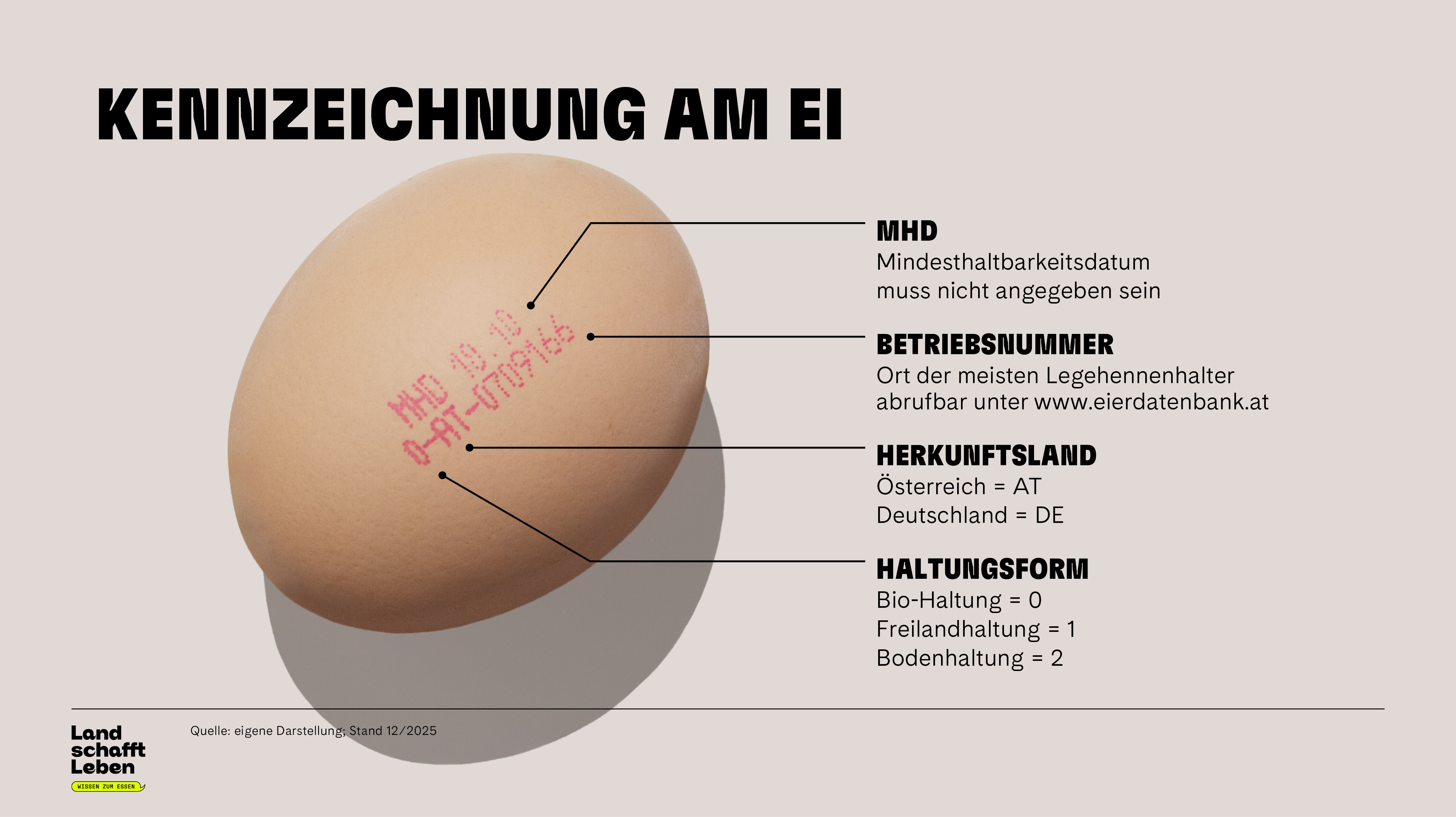 Österreich kann den eigenen Bedarf mit etwa 2,2 Milliarden produzierten Eiern pro Jahr fast selbst decken – Der Selbstversorgungsgrad beträgt rund 90 Prozent. Eier werden hierzulande unter hohen Tierwohlstandards produziert – oft im Gegensatz zu günstiger, ausländischer Ware. Jegliche Form der Käfighaltung ist in Österreich seit 2020 verboten, der Import von Käfigeiern allerdings nicht. Täglich importiert Österreich 1,5 Millionen Eier – größtenteils aus Deutschland, was aber nicht heißen muss, dass die Eier von deutschen Hennen gelegt wurden. Grund dafür sind Re-Exporte: Beispielsweise importiert Deutschland Eier aus der Ukraine und exportiert sie dann weiter, etwa für den Großhandel oder in Form verarbeiteter Lebensmittel wie Kuchen, Nudeln oder Mayonnaise. Als Herkunftsland ist also trotzdem Deutschland angegeben.