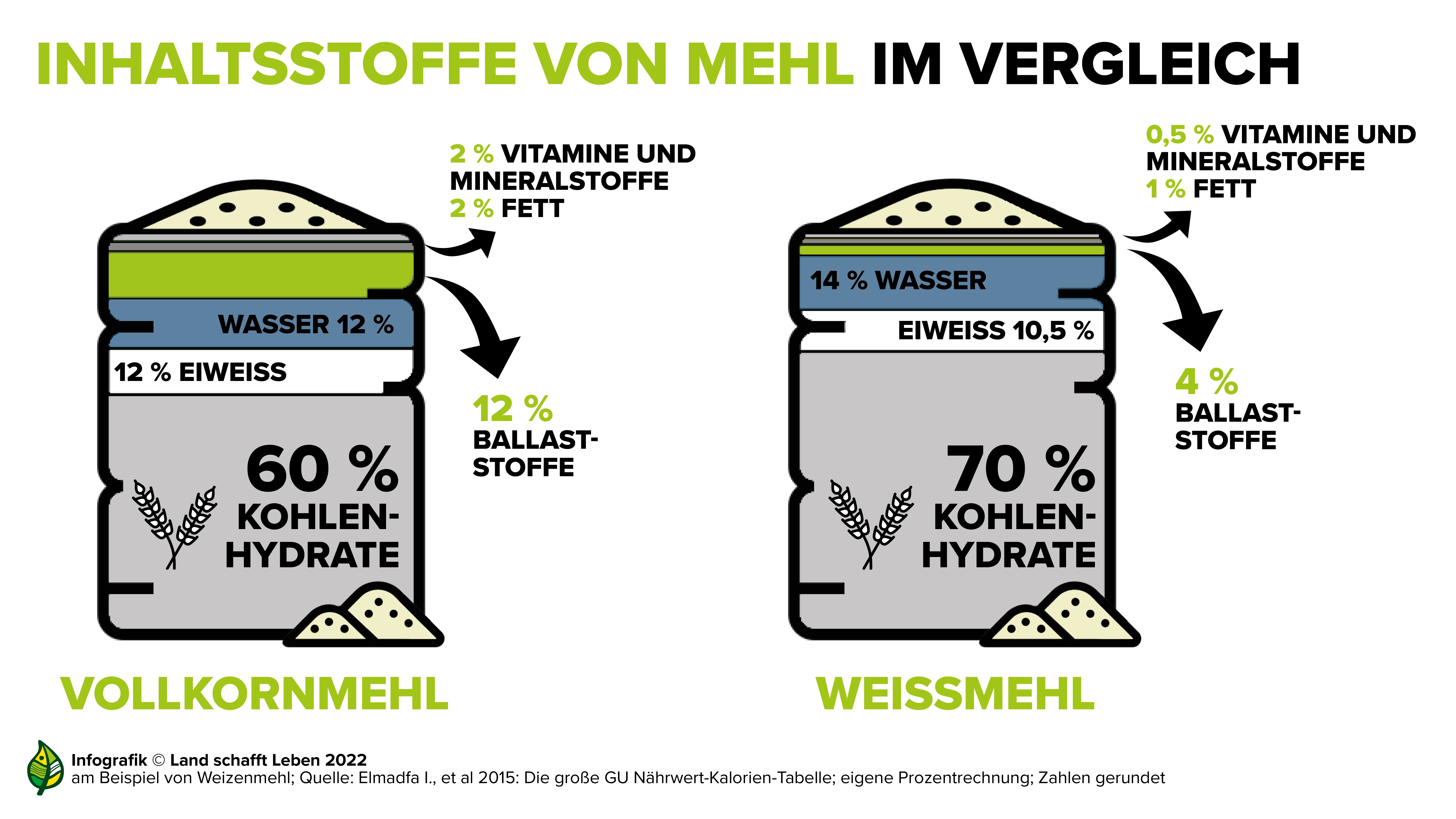 Beim Vermahlen von Weißmehl wird die Schale des Korns vom Mehlkörper und vom Keimling getrennt. Je nach Type werden dann noch 65 bis 80 Prozent des Korns vermahlen. Bei Vollkornmehl hingegen werden durchschnittlich 98 Prozent des Korns vermahlen (bei Weizen). Damit fließen bei Vollkornmehl also fast alle Produktionsressourcen in die Ernährung. Dadurch verteilt sich die Klimawirkung auf eine größere Mehlmenge als bei Weißmehl. Das wiederum macht den Fußabdruck pro Kilogramm Mehl kleiner.