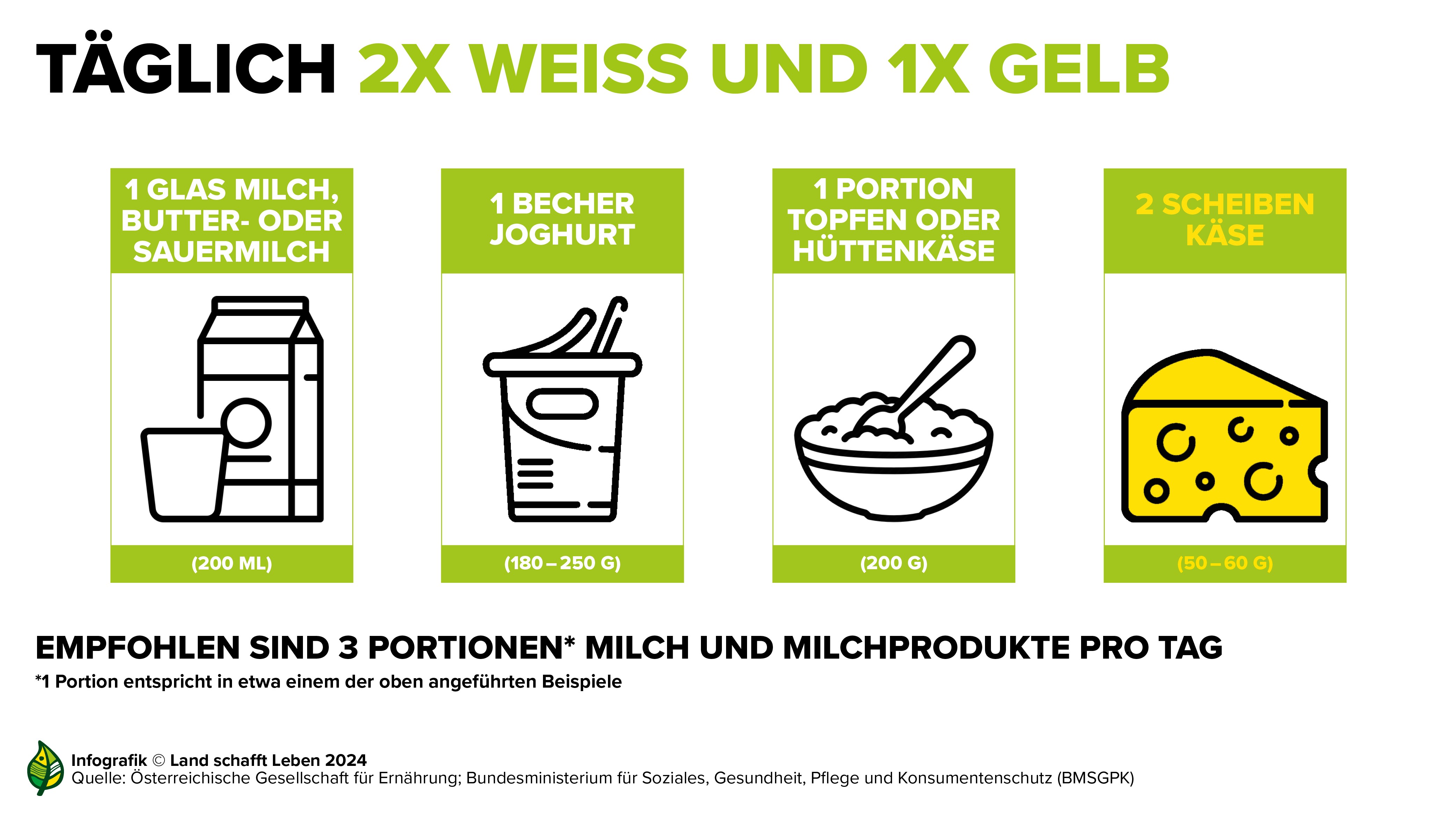 Laut Österreichischer Ernährungspyramide sollte unser Speiseplan täglich drei Portionen Milchprodukte enthalten. Idealerweise handelt es sich dabei um zwei Portionen sogenannter „weißer“ Milchprodukte – also Milch, Joghurt, Topfen, Hüttenkäse und ähnliches – und eine Portion „gelber“ Milchprodukte, also Käse. Die Produkte sollten fettarm und ungesüßt sein. Maria Fanninger, Gründerin des Vereins Land schafft Leben, sagt dazu: