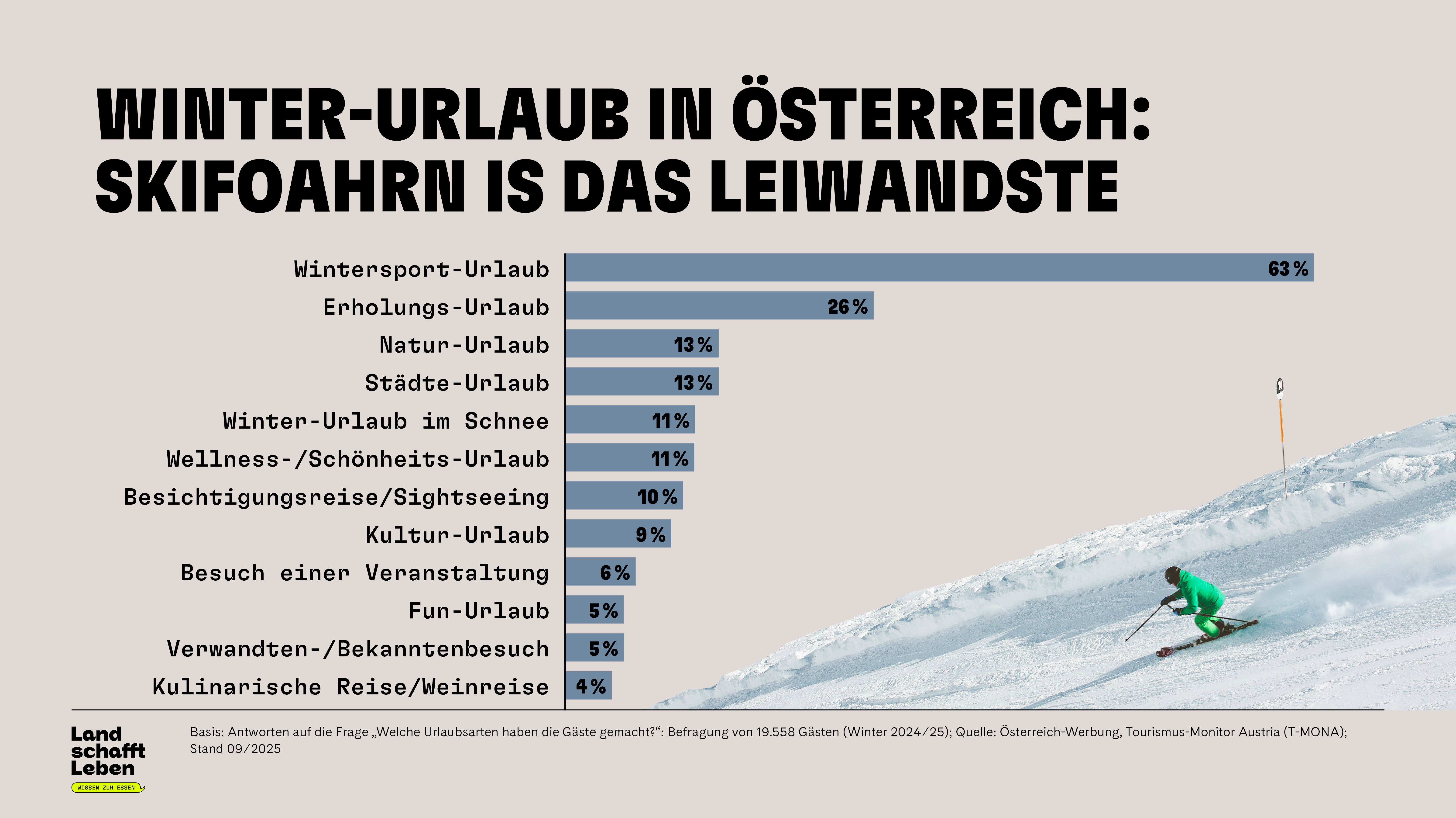 Österreich wird als Winterurlaubsziel hauptsächlich wegen der gebotenen Sportmöglichkeiten gewählt. In direkter Verbindung dazu steht die Kulturlandschaft: Ohne die Arbeit der Landwirtschaft wäre der Skibetrieb in Österreich mit deutlich höheren Kosten verbunden, zeigt der Verein Land schafft Leben auf.