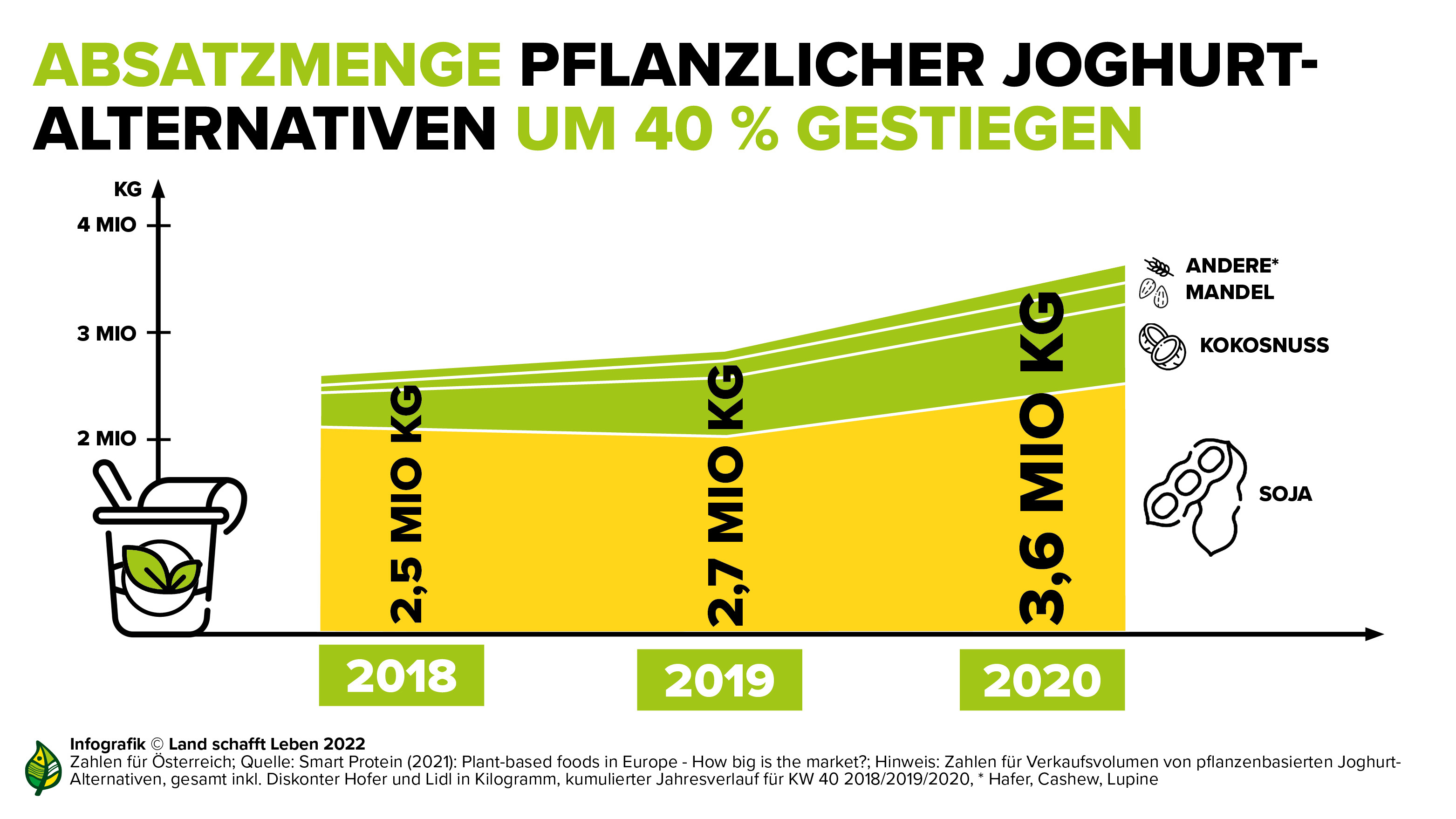 Ähnlich verhält es sich mit pflanzenbasierten Joghurt-Alternativen, wobei Soja hier der beliebteste Rohstoff ist: Mit einem Verkaufsvolumen von etwa 2,5 Millionen Kilogramm beansprucht Soja mehr als die Hälfte des Marktes für sich, gefolgt von Kokos (rund 750.000 kg) und Mandel (rund 258.000 kg).
